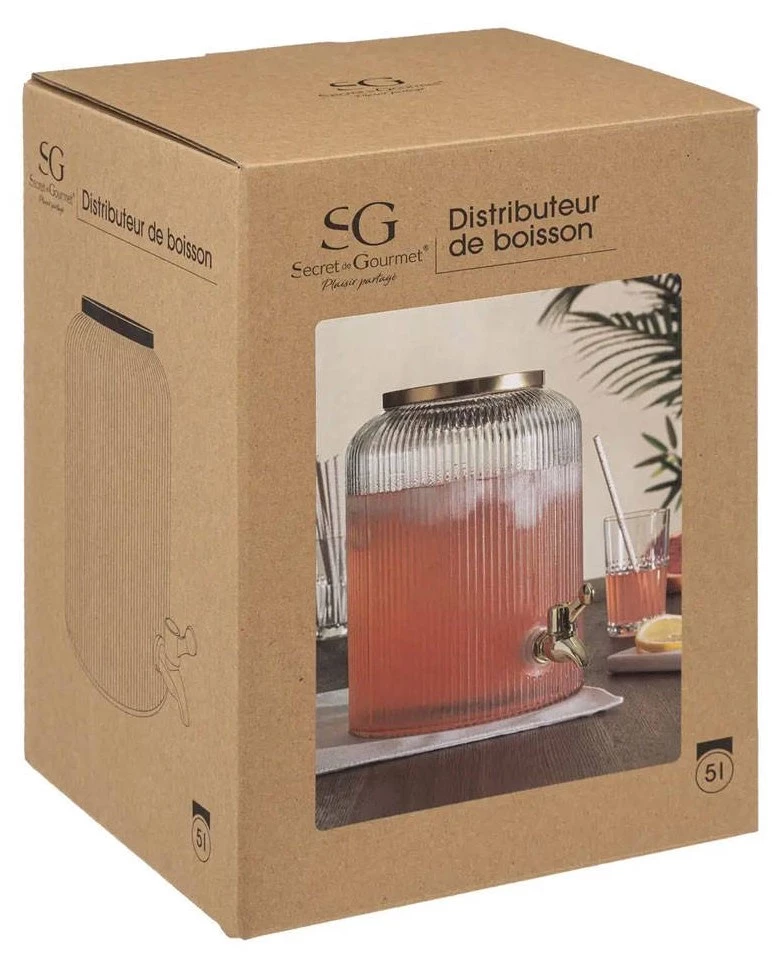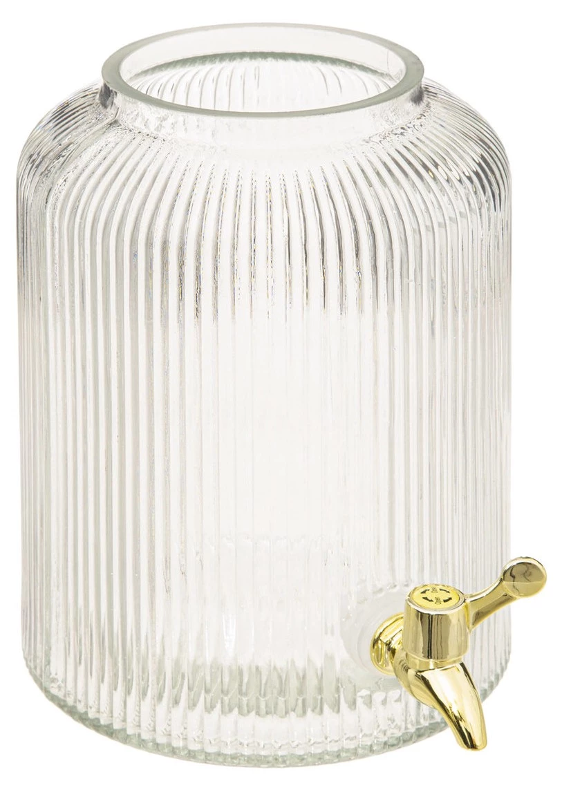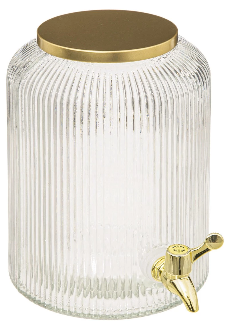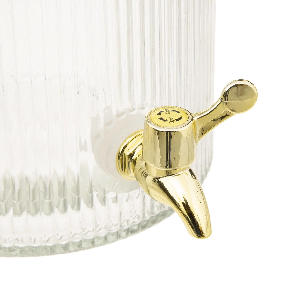 Optik, die ins Auge fällt. Das Glas mit Wasserhahn besteht aus transparentem und geriffeltem Glas. Ein goldener Wasserhahn und ein goldener Schraubverschluss erhöhen elegant die optische Attraktivität.