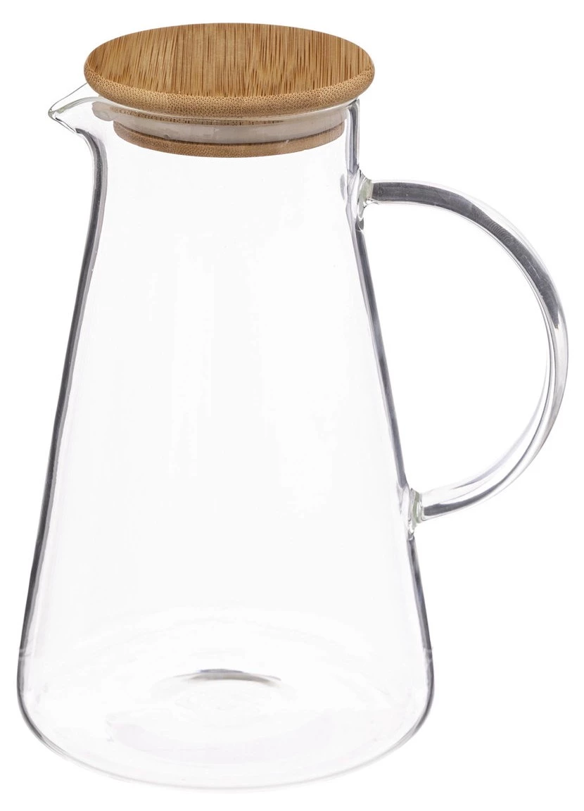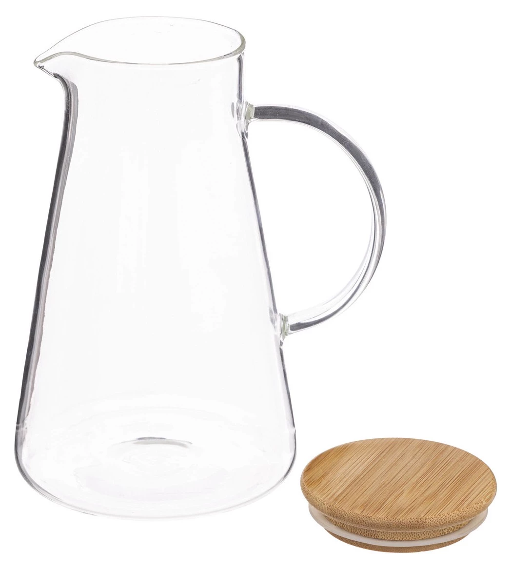 Die Glaskanne war mit einem praktischen Deckel aus Bambusholz ausgestattet. Die Dichtung hält den Deckel fest, sodass er nach dem Kippen der Schale nicht herausfällt. Die Kanne hat einen breiten Einlass, dank dem Sie Eiswürfel, Früchte und Minze in die Mitte legen und dann mühelos die Reste entleeren können.