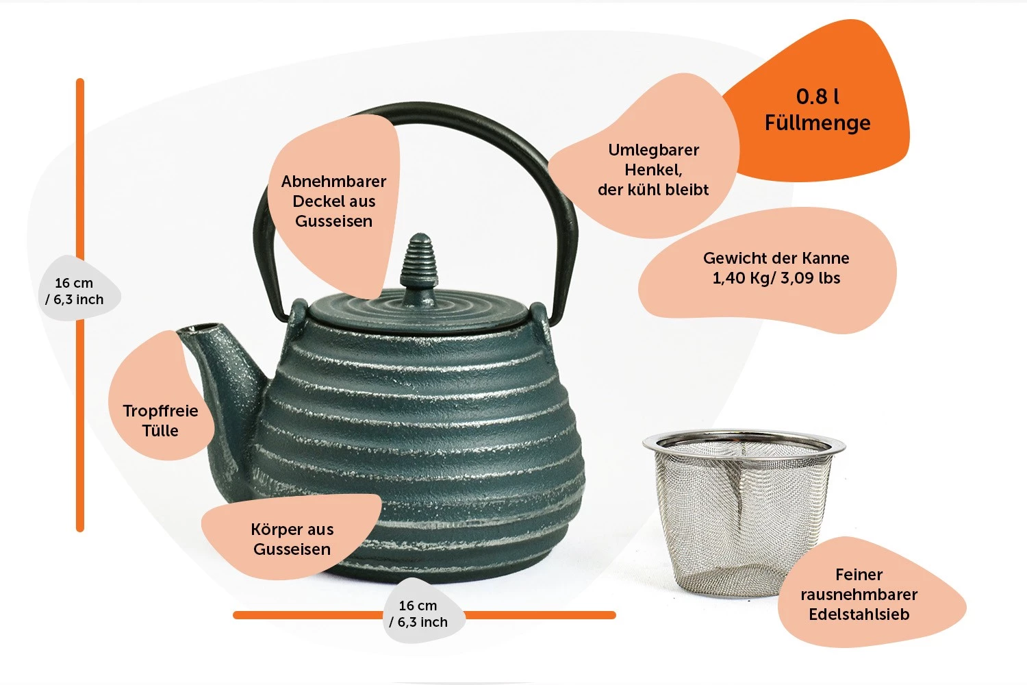 Die Teekanne aus Gusseisen ist innen durchgehend emailliert und wird mit einem Edelstahl-Sieb geliefert. Der Untersatz dient zum Schutz einer jeden Tischplatte. Gusseisen zeichnet sich durch seine Fähigkeit aus, Hitze und Kälte länger zu speichern – ein Vorteil warmen Tee länger zu genießen, aber auch um Getränke zu kühlen. Die beigelegte Gebrauchsanleitung verrät wie man sich lange mit der richtigen Anwendung und der materialbedingten Langlebigkeit an diesem einzigartigen und formschönen Produkt erfreuen wird.