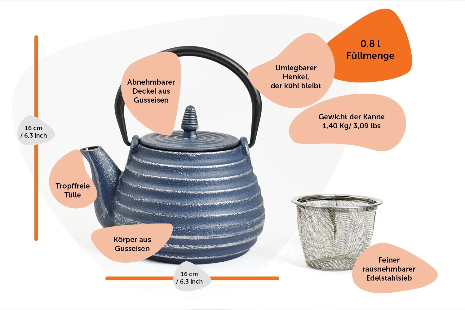 Die Teekanne aus Gusseisen ist innen durchgehend emailliert und wird mit einem Edelstahl-Sieb geliefert. Der Untersatz dient zum Schutz einer jeden Tischplatte. Gusseisen zeichnet sich durch seine Fähigkeit aus, Hitze und Kälte länger zu speichern – ein Vorteil warmen Tee länger zu genießen, aber auch um Getränke zu kühlen. Die beigelegte Gebrauchsanleitung verrät wie man sich lange mit der richtigen Anwendung und der materialbedingten Langlebigkeit an diesem einzigartigen und formschönen Produkt erfreuen wird.
