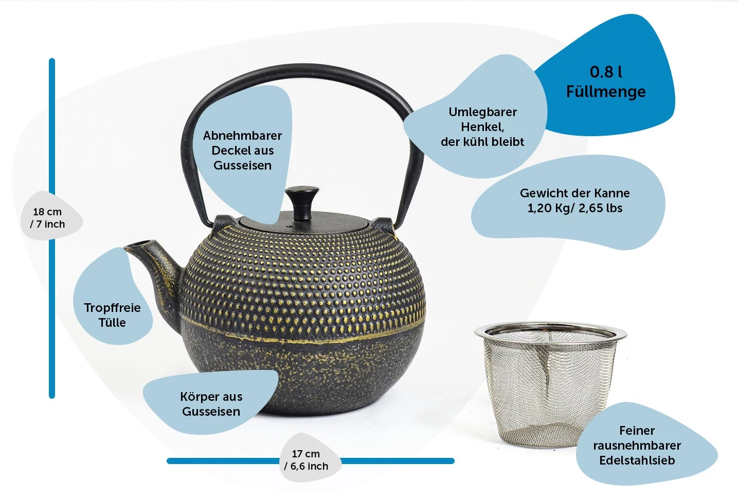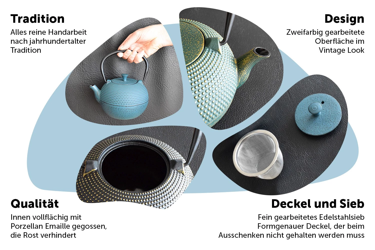 Die Teekanne aus Gusseisen ist innen durchgehend emailliert und wird mit einem Edelstahl-Sieb geliefert. Der Untersatz dient zum Schutz einer jeden Tischplatte. Gusseisen zeichnet sich durch seine Fähigkeit aus, Hitze und Kälte länger zu speichern – ein Vorteil warmen Tee länger zu genießen, aber auch um Getränke zu kühlen. Die beigelegte Gebrauchsanleitung verrät wie man sich lange mit der richtigen Anwendung und der materialbedingten Langlebigkeit an diesem einzigartigen und formschönen Produkt erfreuen wird.