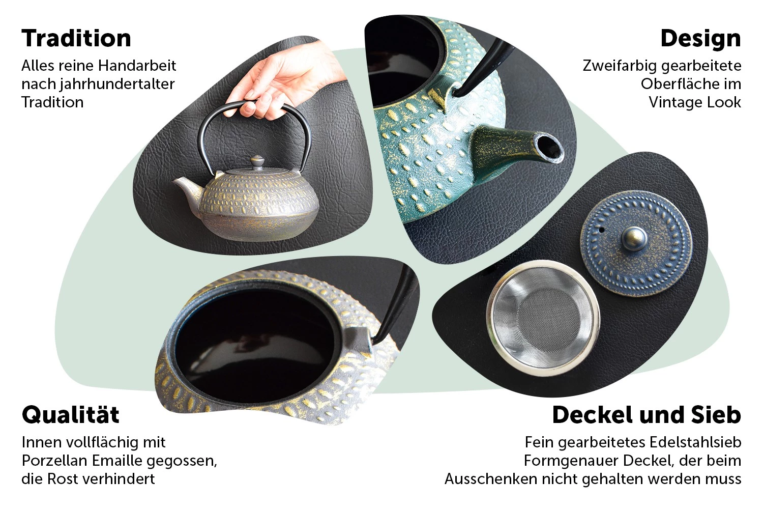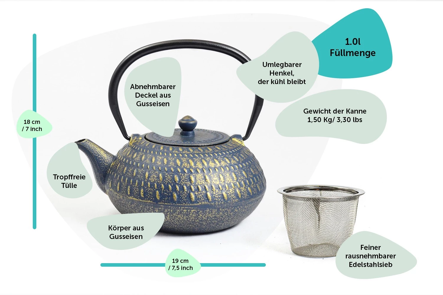 Die Teekanne aus Gusseisen ist innen durchgehend emailliert und wird mit einem Edelstahl-Sieb geliefert. Gusseisen zeichnet sich durch seine Fähigkeit aus, Hitze und Kälte länger zu speichern – ein Vorteil warmen Tee länger zu genießen, aber auch um Getränke zu kühlen. Die beigelegte Gebrauchsanleitung verrät wie man sich lange mit der richtigen Anwendung und der materialbedingten Langlebigkeit an diesem einzigartigen und formschönen Produkt erfreuen wird.